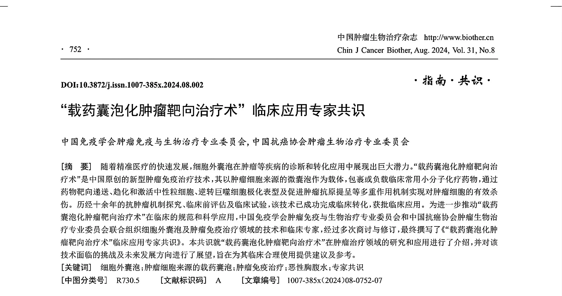 《中国肿瘤生物治疗杂志》2024年第31卷第8期发布了由中国免疫学会肿瘤免疫与生物治疗专业委员会、中国抗癌协会肿瘤生物治疗专业委员会共同牵头制定的《“载药囊泡化肿瘤靶向治疗术”临床应用专家共识(2024版)》(以下简称“《共识》”)。