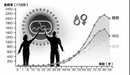 2013年中国第一次发表了《肿瘤年报》,从下图中可以清晰地看出:第一:无论男女,癌症发病率从40岁以后就是指数增长;第二:老年男性比女性得癌症概率高,主要是前列腺癌。