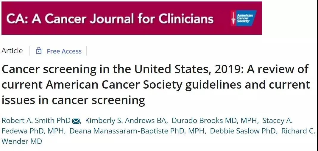 在近期,连续2篇国际顶级医学神刊CA(IF=244)发表文章,阐述癌症的筛选指南,这两篇文章分别是:“Cancer screening in the United States, 2019: A review of current American Cancer Society guidelines and current issues in cancer screening”及“A blueprint for cancer screening and early detection: Advancing screening’s contribution to cancer control”,重点谈到了乳腺癌,宫颈癌,结直肠癌,子宫内膜癌,肺癌和前列腺癌的筛查指南,最后,文章重点阐述了筛查测试与益处,局限性和危害有关,在制定指南和与患者沟通筛查价值时必须考虑这些因素。