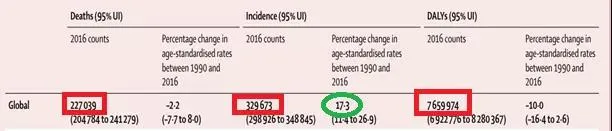 2016年,全球有227,039例病例死于CNS癌症,年龄标准化死亡率为3.24/10万人年,1990年至2016年间的死亡率无明显变化;