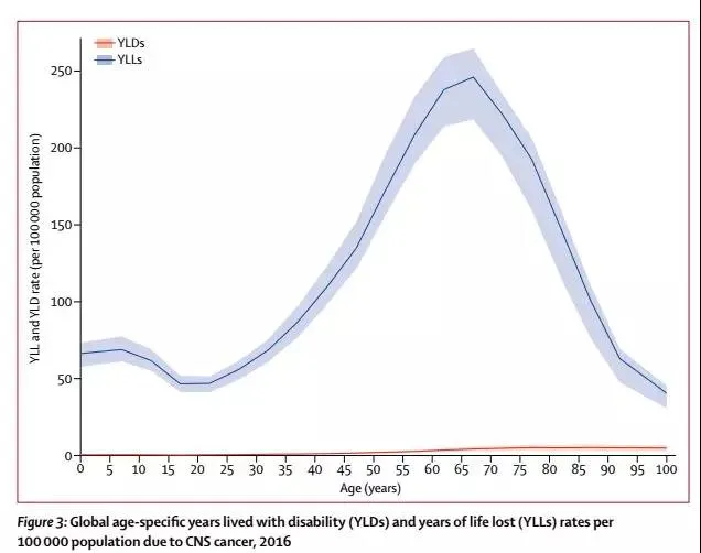 CNS癌症的DALY是由因早死所致的生命损失年(YYL)而不是疾病所致伤残引起的健康生命损失年(YLD)所驱动的。YYL在65~69岁之间达到峰值,如图4所示。