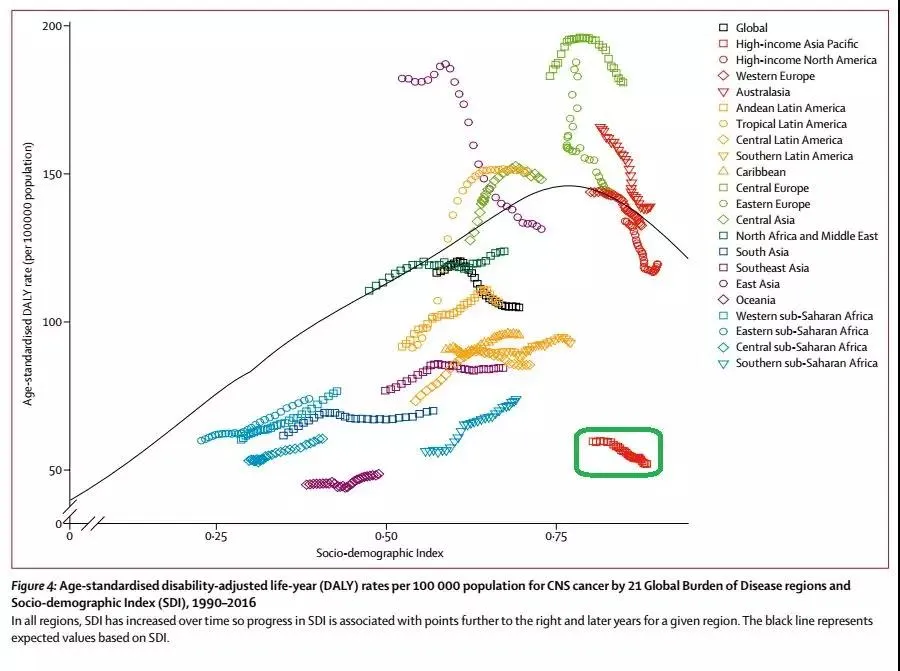 但区域模式与此有很大偏差。一些地区的DALY率随SDI改善而上升,而另一些地区的DALY率下降,或者与SDI之间不存在单调的关系。此外,在高收入国家中,收入较高的亚太地区以较低的DALY率而显得格外突出(如图5中的绿色方框所示)。