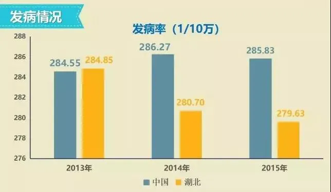 数据显示,2015年,湖北省肿瘤登记地区恶性肿瘤新发病例数为44771例,发病率279.63/10万,其中城市地区发病率308.92/10万,农村地区250.14/10万。发病前5位分别是肺癌、乳腺癌、肝癌、结直肠癌、胃癌。