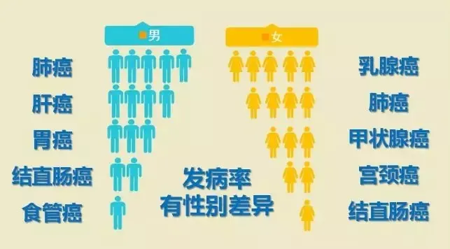 男性在35-64岁发病前5位分别是肺癌、肝癌、胃癌、结直肠癌和食管癌;65岁肺癌发病率依然位居第一,其次是胃癌、肝癌、结直肠癌和食管癌。