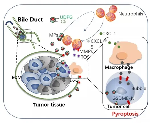 MTX-MPs治疗梗阻性肝外胆管癌。MTX-MPs通过UDPG/C5,趋化中性粒细胞,后者破坏胆管癌基质屏障,MTX-MPs进入肿瘤细胞,诱导其焦亡,进一步激活巨噬细胞分泌趋化因子,加强对中性粒细胞的趋化;同时,中性粒细胞释放自由基杀灭肿瘤细胞。