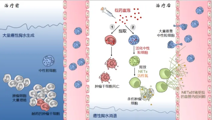 中性粒细胞是人体抵御细菌入侵最主要的细胞类群,随血液循环而流动。载药囊泡募集大量中性粒细胞至胸腔,中性粒细胞通过释放活性氧(ROS)和胞外诱捕网(NET)杀伤肿瘤;局部大量高度黏性的NET释放,能高效封堵胸膜壁上的毛细血管缝隙,直接抑制液体渗漏至胸腔,促使胸水快速缓解;载药囊泡被胸水中肿瘤相关巨噬细胞TAM大量摄取,杀死抑制性的TAM;同时,增加CD4+和CD8+ T细胞的数量,促进IL-2、IFN-γ、TNF-α和IL-17等免疫激活相关细胞因子的释放,进而调控肿瘤免疫微环境,抑制肿瘤和恶性胸腔积液的进展。