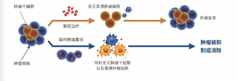 载药囊泡具有独特的生物膜结构,能从蛋白及基因水平上降低多药耐药蛋白的表达,抑制肿瘤细胞对化疗药物的外排,逆转肿瘤细胞耐药性。此外,针对肿瘤复发和转移的元凶——肿瘤干细胞,其比分化的肿瘤细胞更柔软,易变形,因此更易吞噬载药囊泡后被杀伤,达到“擒贼先擒王”的效果,抑制肿瘤的生长。