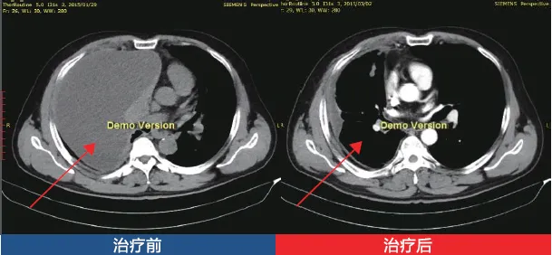 治疗前:患者胸闷,呼吸困难,CT结果显示右侧胸腔大量胸水。